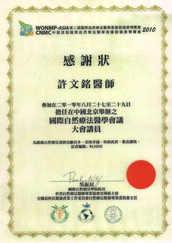 # 2010 擔任北京國際自然療法醫學會議大會講員